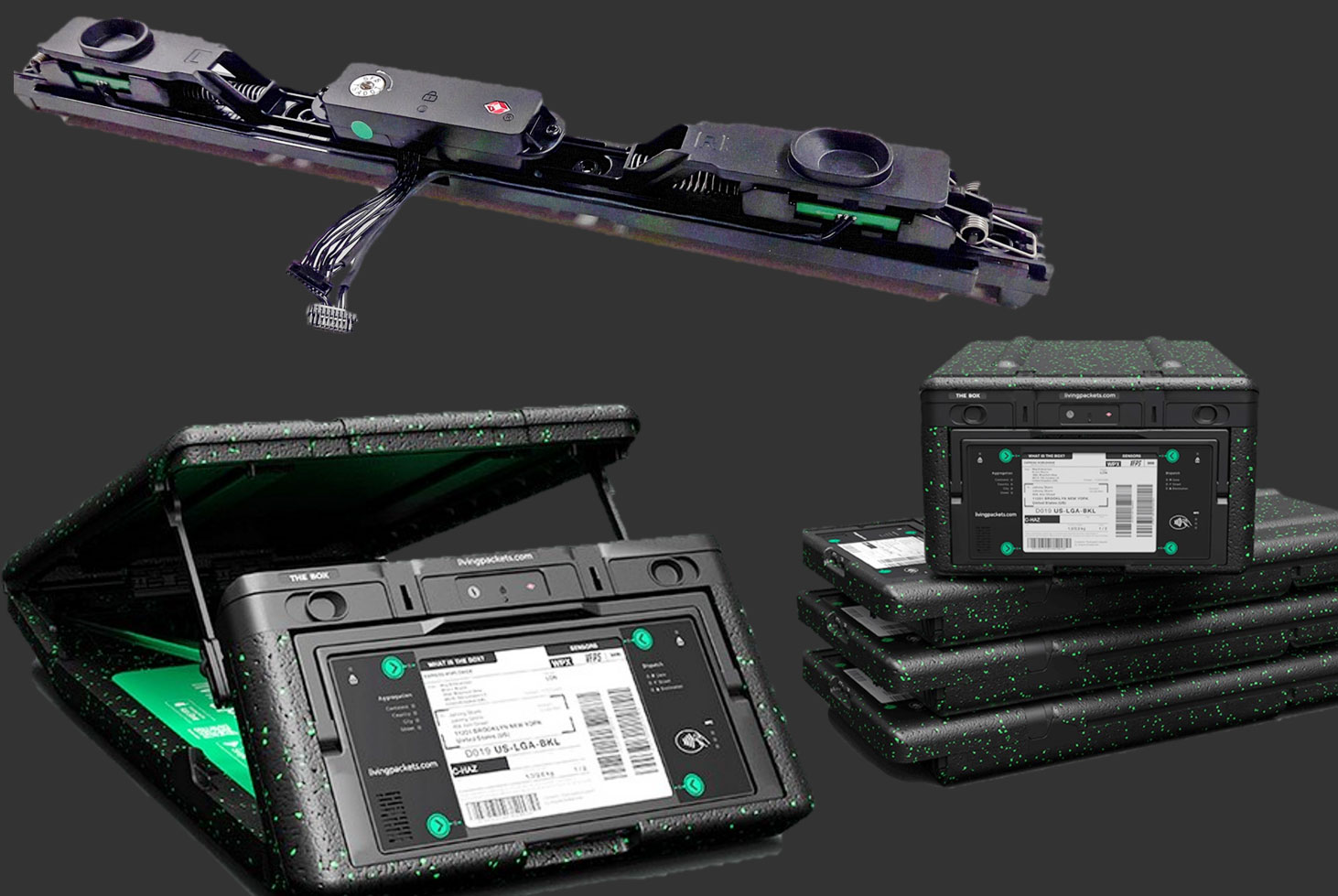 Schlossmodul (oben), geöffnete Verpackung mit Schlossmodul (unten links) und verschlossene Verpackung (unten rechts).